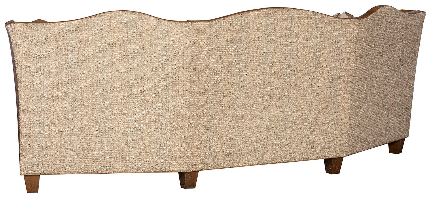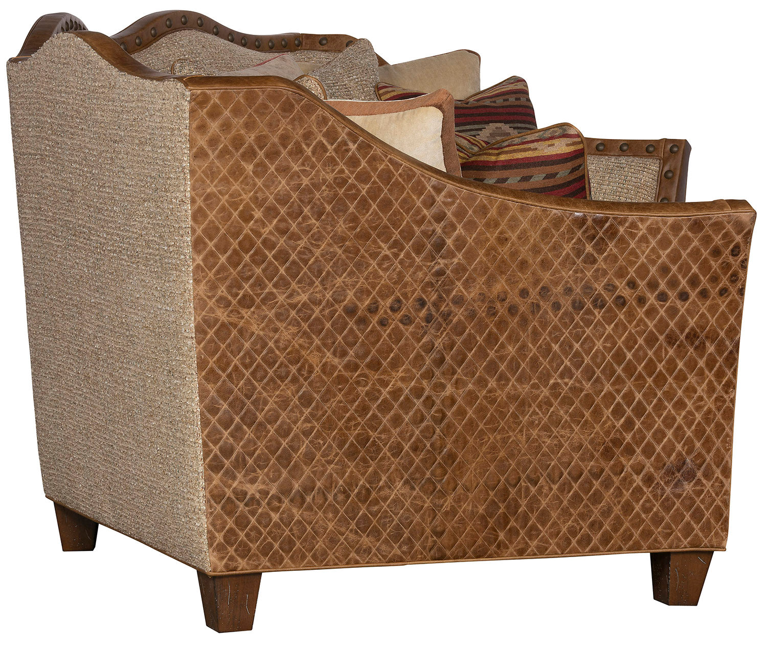 Gracefully curved and richly detailed, the Canyon Crest Conversational Sofa captures the soul of the Southwest in every stitch. Its hand-burnished leather arms and base are paired with a warm, textured fabric seat, accented by bold woven pillows in desert reds, golds, and deep earth tones. Nailhead trim traces the sculpted silhouette, while embossed leather side panels evoke the artistry of tooled saddlery. With its blend of refined comfort and rugged character, the Canyon Crest Conversational Sofa is the perfect centerpiece for any space that honors heritage, craftsmanship, and timeless design.Â